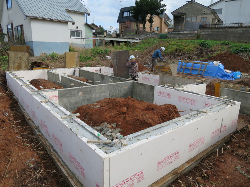 アンカーボルトを固定していた桟木が取り除かれ、型枠を固定するために断熱材を貫通していたボルトも外されました。