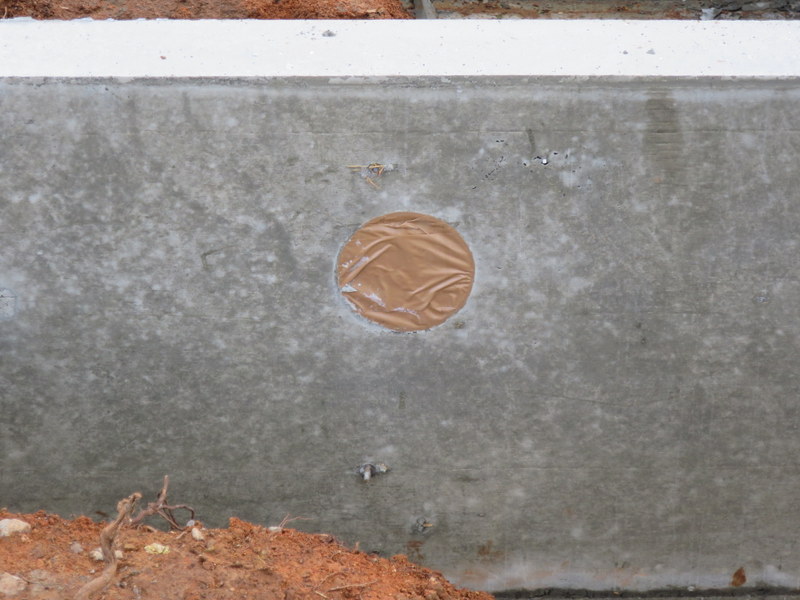 配管を通すための貫通スリーブです。型枠の間に紙のボイド管または塩ビ管を仕込んでいました。コンクリートが中に入り込まないようガムテープが張られていますが、これを取り除くと丸い貫通穴が開いています。
