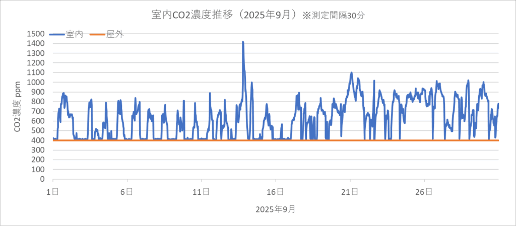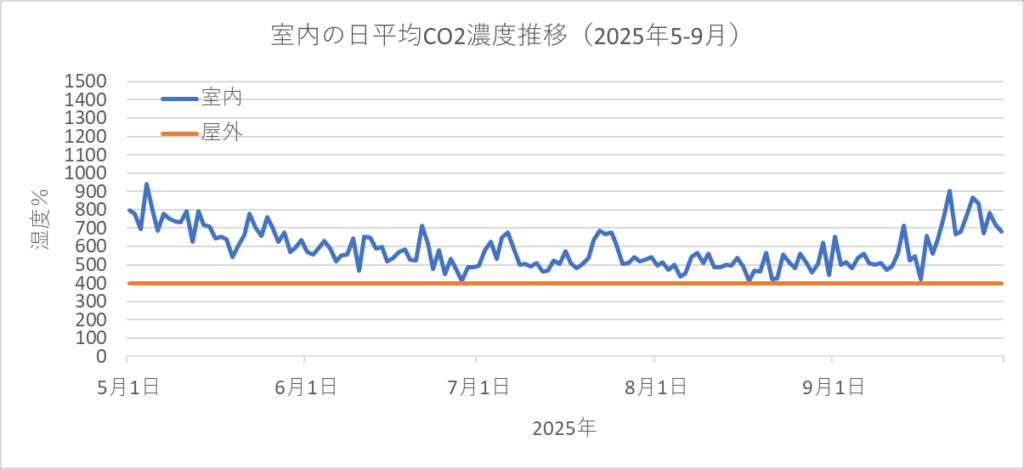 5月前半や9月後半は肌寒いために窓を開ける時間が少なく換気はほぼ換気扇のみです。そのためCO2濃度が高めになっています。6月から8月は窓を開けることが多いためCO2濃度が低くなっていますが、真夏のほんとうに暑い日は外気を遮断するために窓を閉める時間が増えます。全体に1000ppm以下に抑えることができており空気の質は保たれています。