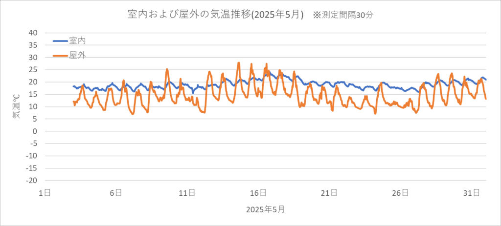 30分ごとに測定した気温の1か月にわたるグラフです。5月は屋外気温の変化が大きいですが室内気温は変化が少なく安定しているのがわかります。冷暖房無しですが室温15℃から25℃のあいだをキープしており快適でした。外が肌寒い日は窓は開けず、ぽかぽか暖かい日は窓を開けて室温を調整しています。