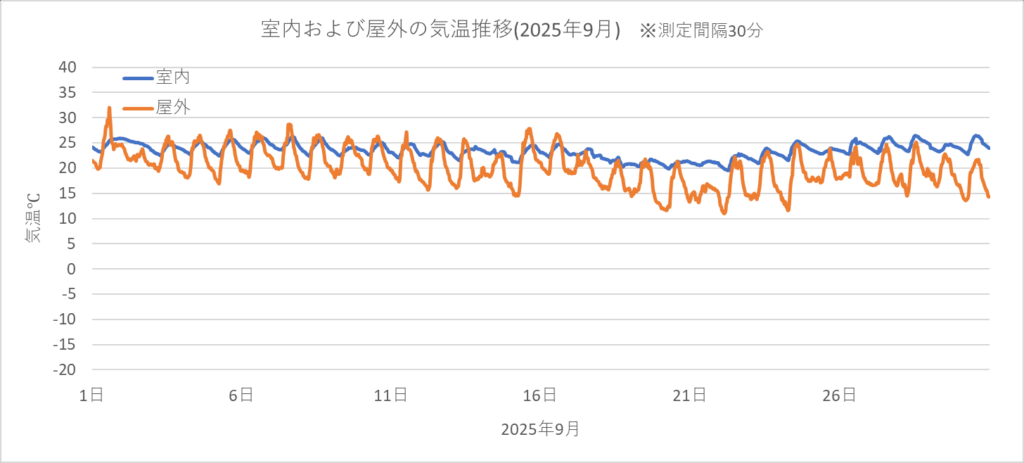 9月は初日だけ30℃を超えましたが2日以降は暑さが和らぎ過ごしやすい月でした。中旬以降は秋らしく気温の変化が大きくなり朝晩は肌寒い日もあります。室温は20~25℃の範囲にある時間がほとんどで快適そのものでした。8月下旬から9月中旬にかけては日中に窓を開け続けることが多かったです。気温が下がってきた9月20日には高窓のよしずを取り外し、天井付近の換気扇の連続稼働を止めました。室温が下がりすぎないように日中に日射熱を多く取り入れて日没後はそれを逃がさないためです。その効果もあって9月下旬は室温が常に外気温より高い状態になっています。