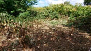 敷地に生えている木を植物図鑑やネットで調べるとニセアカシア、ヌルデ、オニグルミなどで、草はオオイタドリ、ササ、ヨモギ、ヤマブドウなどと推定できました。この土地は建物が建てられたことがないらしく、前の土地所有者も50年に渡って放置していたため原野と化していました。昭和のころから空地なのでゴミの不法投棄もかなり行われているようです。