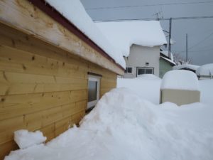 軒の出を短くしたことも反省点です。軒を伸ばしたほうが外壁・窓に雨がかかりにくく、落雪が外壁から遠ざかるので除雪が楽になることが期待できます。現状はこまめに除雪しないと写真のように窓が雪ですぐに覆われてしまいます。