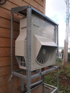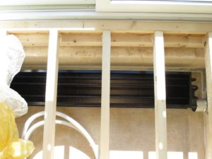 ヒートポンプ温水暖房システムはエアコン暖房と同じ原理で空気を暖める代わりに水(実際は不凍液)を温めて家の各所に設置した放熱器に供給する方法です。この家では放熱器を床下に設置しました。基本的に暖房用のシステム構成ですが冷水を流すこともできます。