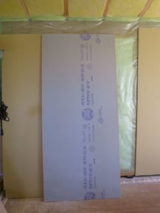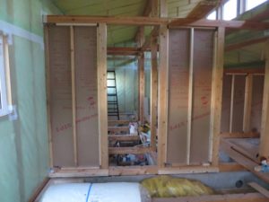 この家では耐力壁として外壁の屋外側にガラス繊維混入せっこう板、室内側に仕上げ下地も兼ねた普通せっこうボード、間仕切り壁の一部に構造用パーティクルボードを使っています。住宅性能表示制度における耐震等級は2となります。