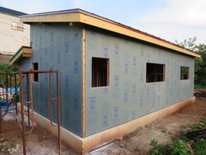 外壁に使ったガラス繊維混入せっこう板は透湿性能に優れているため採用しました。壁内の水蒸気を逃がして結露を防ぎます。