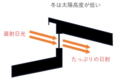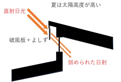 太陽光は明るさだけではなく熱ももたらします。寒さが厳しい冬はできるだけ多くの日射熱を取り入れ、年々暑くなっている夏は直射日光を遮ることが大事です。この家では夏のあいだ破風板によしずを付け加えて高窓からの光をコントロールしています。
