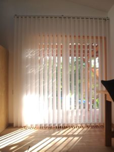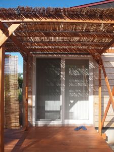 テラス窓については外にウッドデッキを設けてその上によしずの屋根をかけて直射日光を軽減しています。よしずは冬になると取り外します。