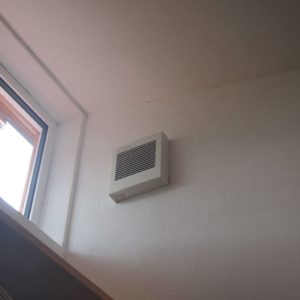 この家では常時オープンの給気口が床下に3か所あり、予備として天井付近に1か所設けています。床下給気口の屋外側は入口が雪に埋もれないように煙突のように配管を上に伸ばしています。床下から入った冬の外気は放熱器で温められて室内に給気される仕組みです。