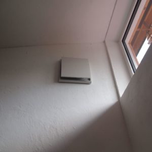 一方で排気のほうは24時間常時運転の換気扇がトイレにあります。給気口から入って室内を循環した空気は最終的にトイレのドア下の隙間を通って換気扇で外へと排気されます。この空気の流れによりトイレの臭いは他の部屋に漏れません。それ以外の換気扇は夏場の熱気を抜くために天井付近に一つ、浴室とキッチンに一つずつあります。